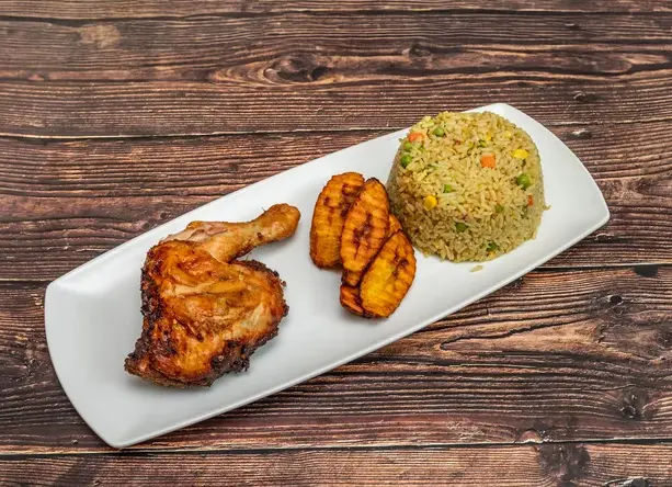 a savory dish featuring your choice of protein stir-fried rice and sweet fried plantains