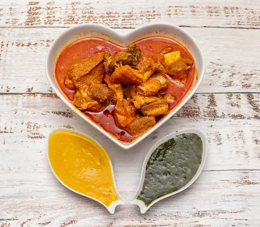 Assorted Goat meat stew with any choice of Amala, Eba and Poundo write it on the order note