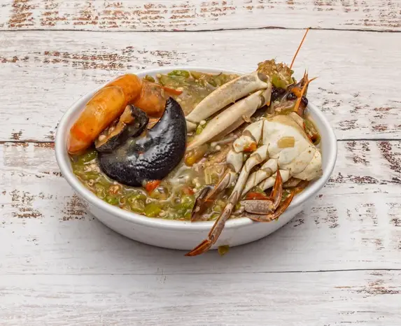 a delicious and nutritious dish featuring okra soup with Hake fish,Snail,Shrimps,Stock fish,Dry fish,cra,squid rings and your choice of Amala, Eba or Poundo